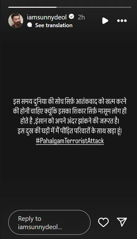 बॉलीवुड अभिनेता सनी देओल ने भी इस हमले पर अपनी भावनाएं साझा कीं। उन्होंने इंस्टाग्राम स्टोरी में लिखा, “इस समय दुनिया की सोच सिर्फ आतंकवाद को जड़ से खत्म करने की होनी चाहिए, क्योंकि इसका शिकार हमेशा मासूम लोग ही होते हैं। इंसान को खुद के अंदर झांकने की जरूरत है। इस दुखद घड़ी में मैं पीड़ित परिवारों के साथ हूं।”