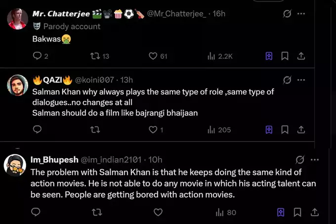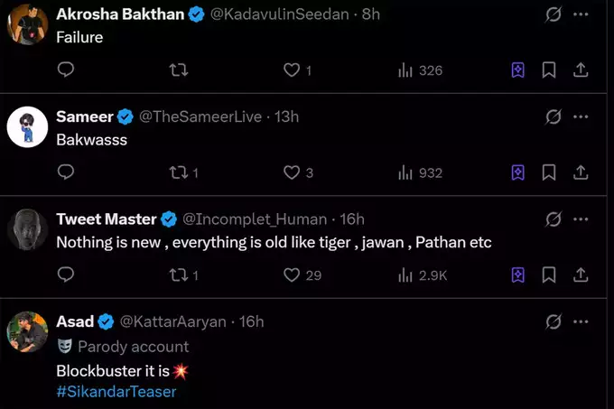वहीं, कुछ यूजर्स ने ‘सिकंदर’ के टीजर को ‘टाइगर’, ‘पठान’, और ‘जवान’ जैसी फिल्मों के टीजर से मिलते-जुलते पाया। इन यूजर्स का कहना था कि टीजर में कुछ नया नहीं था और यह उन्हीं फिल्मों जैसे दिखा। इन टिप्पणियों को देखकर कई सोशल मीडिया यूजर्स ने दोनों फिल्मों के सीन का कोलाज बनाया और सोशल मीडिया पर खूब प्रतिक्रिया दी।