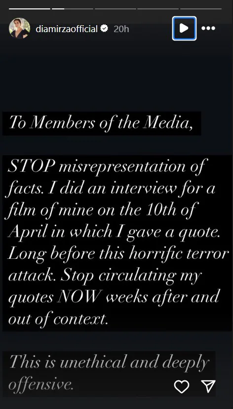 इंस्टाग्राम स्टोरी पर दीया ने लिखा, “मीडिया से निवेदन है कि तथ्यों को गलत तरीके से पेश करना बंद करें। मैंने 10 अप्रैल को अपनी एक फिल्म के प्रमोशन के दौरान एक इंटरव्यू दिया था, जिसमें मैंने एक बयान दिया था, जो इस भयानक आतंकवादी हमले से बहुत पहले का था। कृपया मेरे शब्दों को अब एक सप्ताह बाद संदर्भ से बाहर प्रसारित करना बंद करें। यह अनैतिक और अपमानजनक है।”