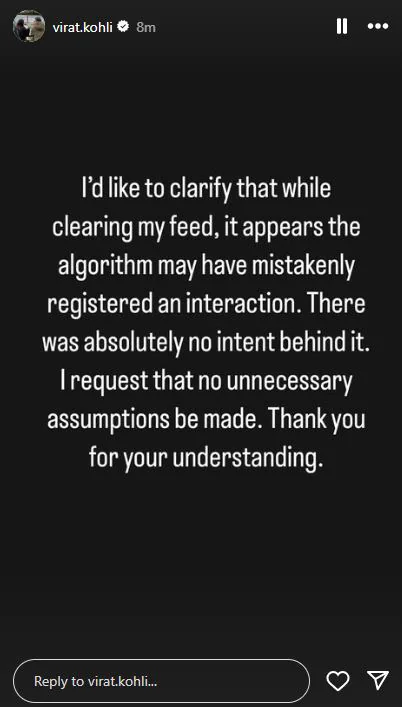 इसी बीच, विराट कोहली ने इंस्टाग्राम स्टोरी पर एक पोस्ट के जरिए इस मुद्दे पर सफाई दी। उन्होंने लिखा, “मैं यह साफ करना चाहता हूं कि जब मैं अपना फीड क्लियर कर रहा था, तो एल्गोरिथ्म ने गलती से कोई इंटरैक्शन रजिस्टर कर लिया था। इसके पीछे कोई इरादा नहीं था। मैं अनुरोध करता हूं कि कोई अनावश्यक धारणा न बनाई जाए। आपके समझने के लिए धन्यवाद।”